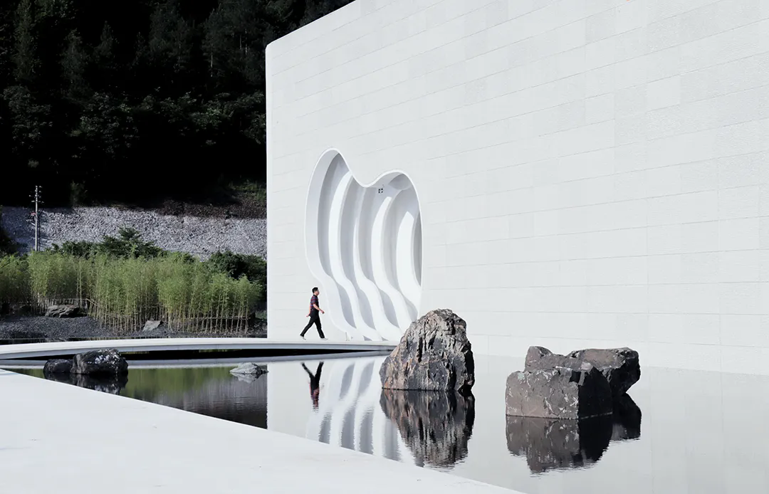 国纸水街建筑项目位于安徽省宣城泾县中国宣纸小镇入口,坐落在美丽的乌溪水畔,包括游客中心、红星宣纸制作表演区、红星宣纸制作体验区和红星宜纸售卖区四个功能区块。中国宣纸小镇国纸客厅建筑以"纸山行"为概念,通过白色清水混凝土模拟宣纸质感,白色清水混凝土切片为主要元素,通过建筑与景观一体化设计,在乌溪江畔,安放一座可以游赏的如画“纸山”。用如画的建筑,传达红星宣纸的独特韵味。人在山中行,如在画中游。